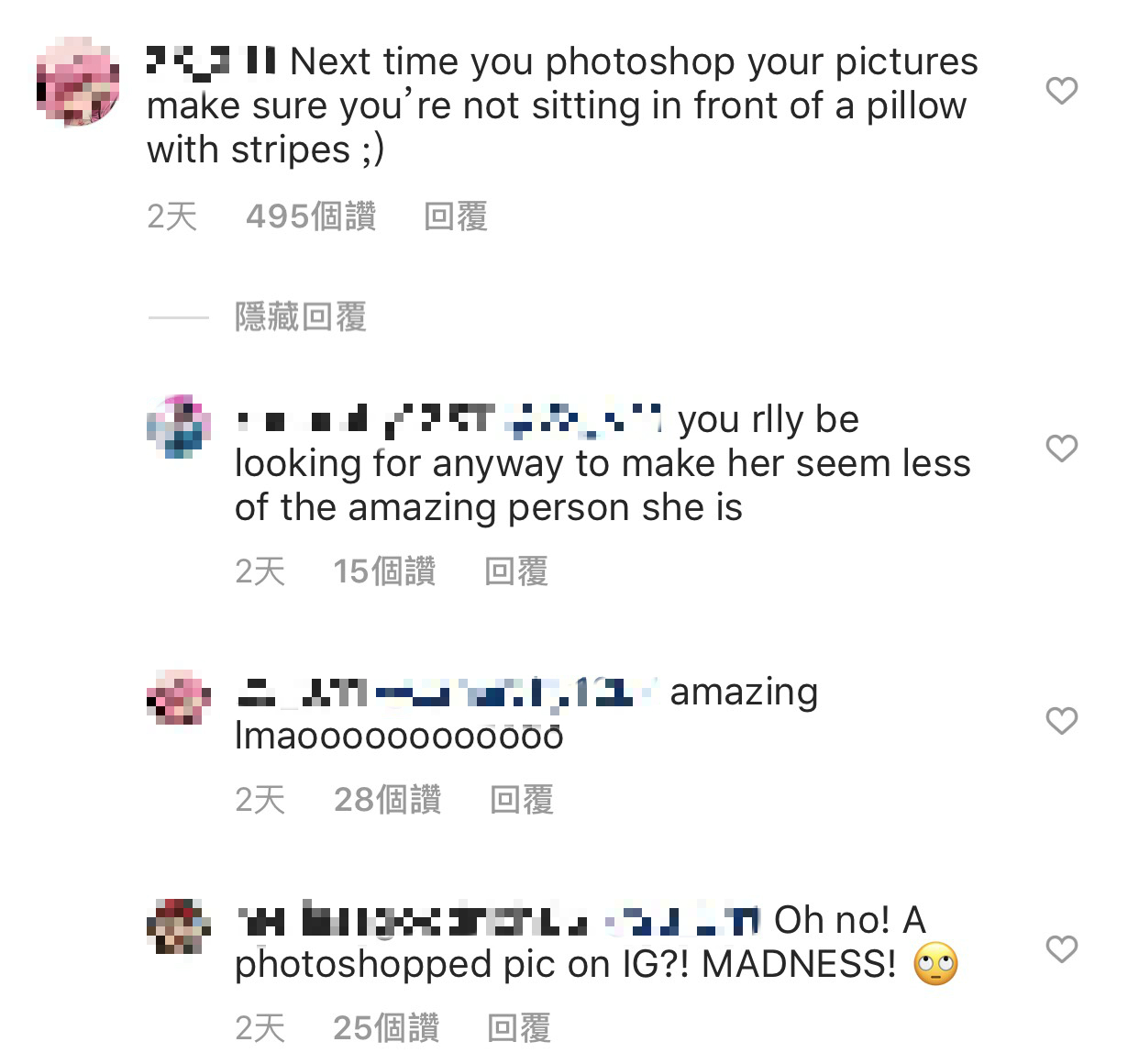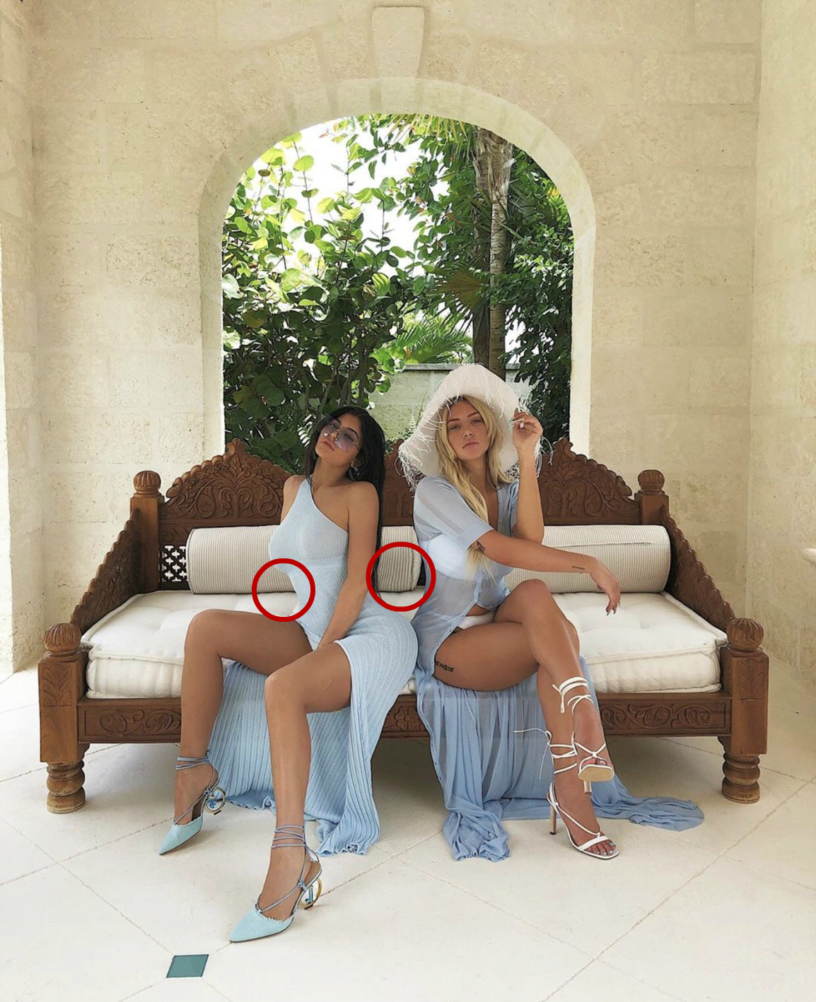 近日,凱莉·詹娜和好友去度假,曬出一系列度假美照,其中一張凱莉·詹娜和好友坐在椅子上,倆人都穿著淡藍色系,身材性感火辣、凹凸有致。但有眼尖的網友發現照片後方枕頭的線條扭曲,紛紛留言表示,「下次你修圖前,先確定沒有坐在有條紋的椅子」、「哦不,IG上有被修圖的照片」。