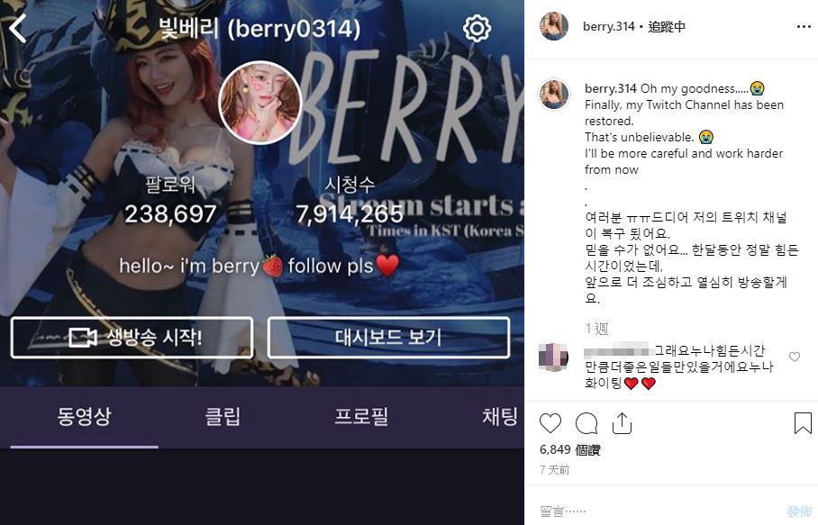 原先在TWITCH上因遊戲實況走紅的Berry,6月初因為Cos娜美被韓媒體誤指該內容在平台上播出,由於TWITCH禁止不雅行為導致帳號無辜被停權,上周,Berry透過IG驚喜宣布帳號回歸,並發文激動說到「天啊真的好不敢相信,我的帳號復活了,從現在起會更小心使用的」也讓不少等了1個多月的粉絲表示「真是太好的消息了」。