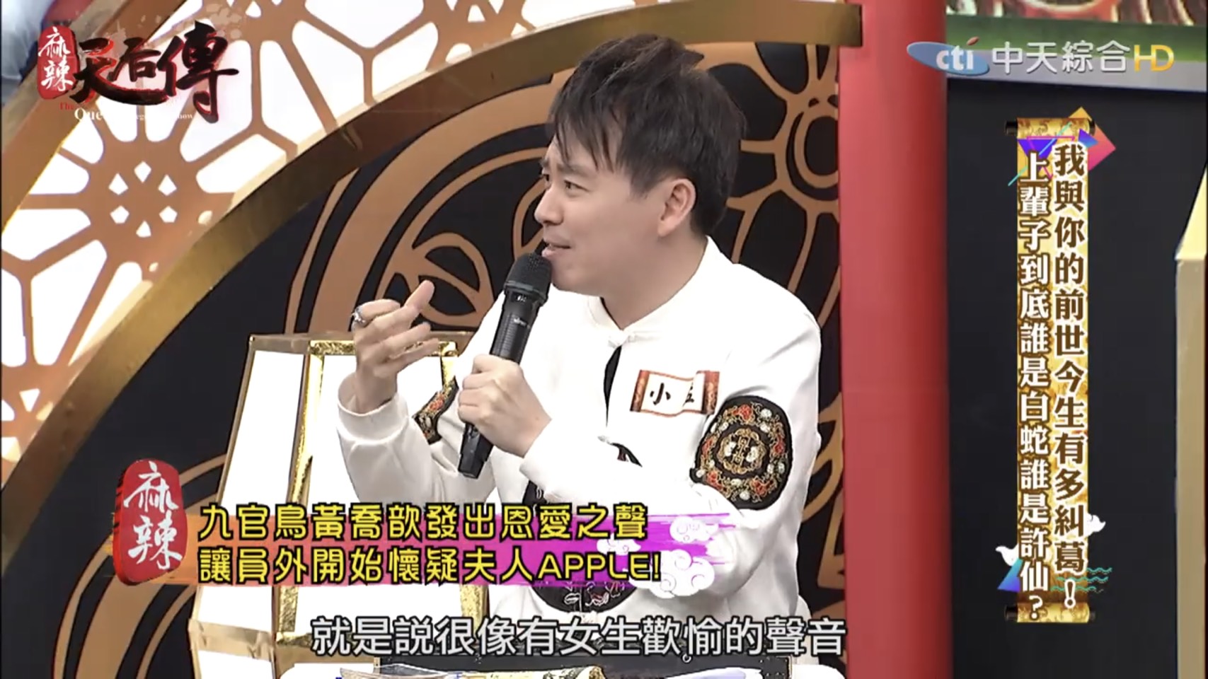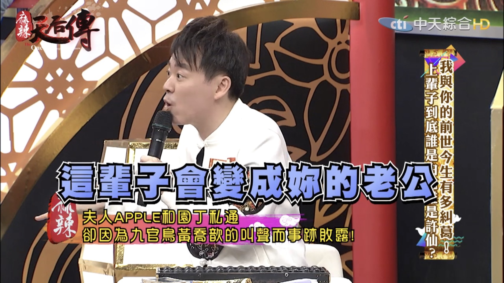 國師解釋,前世Apple是員外老婆,瑤瑤是九官鳥,很會模仿人講話,Apple有一天經過市集,看九官鳥很會模仿就將牠買回家。有一天員外餵食九官鳥時,鳥發出淫穢的聲音,還叫了園丁的名字,員外想想不對勁,開始懷疑夫人,夫人和園丁也承認姦情,他們以為是員外自己發現,殊不知是九官鳥出賣了自己,後來員外趕走了園丁,並把夫人關進柴房。