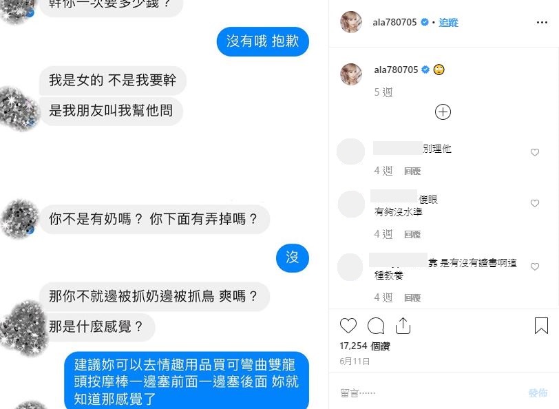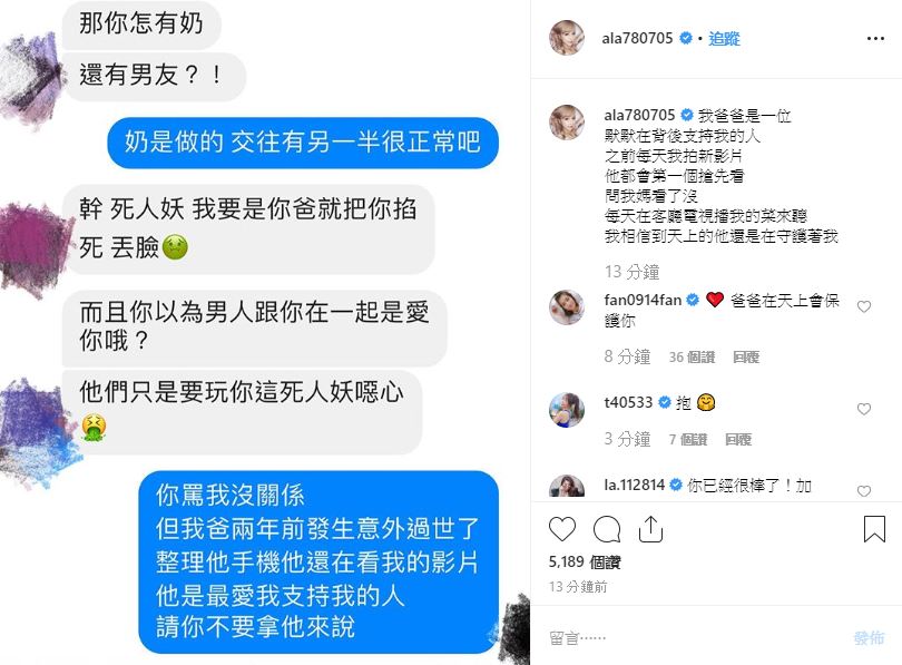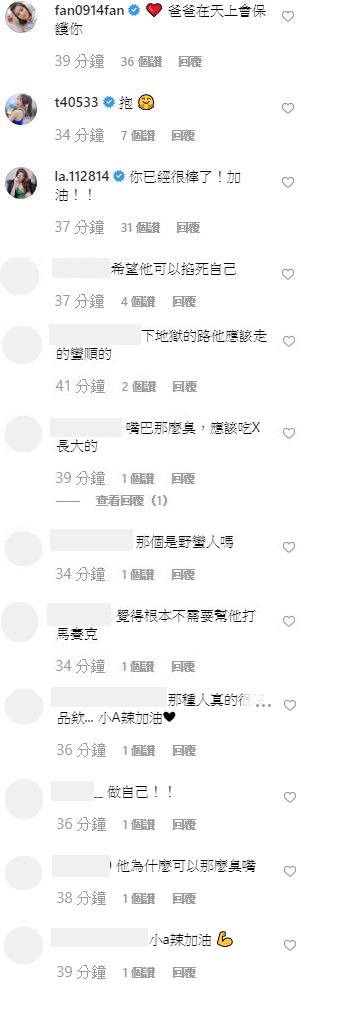 粉絲也紛紛留言:「希望他可以掐死自己」、「別看沒教養的人寫的」、「嘴巴那麼臭,應該吃X長大的」、「覺得根本不需要幫他打馬賽克」、「那種人真的很沒品欸... 小A辣加油」、「為什麼可以那麼臭嘴」、「小a辣加油」,而網紅好友凡凡、梓梓、蕾菈也留言:「爸爸在天上會保護你」、「抱」、「你已經很棒了!加油!!」事實上過去小A辣便曾經分享過自己和酸民的對話,當時也看得出雖然酸民十分無理,她仍相當客氣地回應對方,讓人看見她大度的一面。