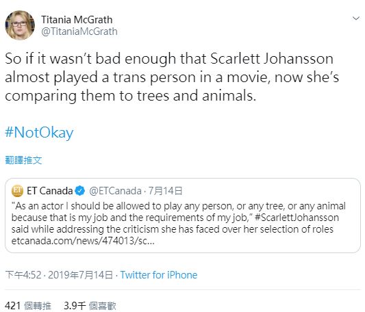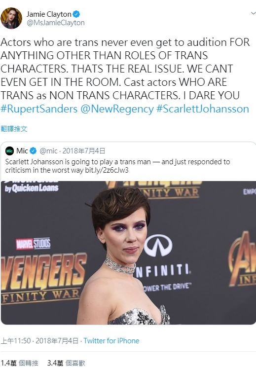 美國影星史家蕾喬韓森(Scarlett Johansson)除演出漫威英雄片以「黑寡婦」一角走紅外,也嘗試不同戲路讓外界看到她的演技,不過去年受邀參演跨性別議題的電影《Rub & Tug》卻備受質疑而辭演,時隔一年時間,史嘉蕾近日接受專訪時,再度以演員身分出發表態「我應該被允許演任何人、任何、任何動物數」引起外界針對戲劇這門藝術和政治議題之間的拉扯的討論。