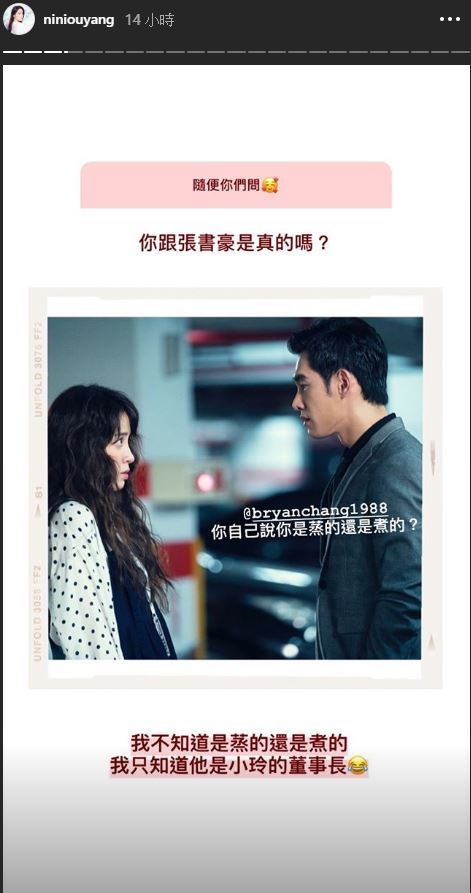 至於歐陽妮妮,同樣也被問到「你跟張書豪是真的嗎?」對此,妮妮PO出兩人合作的劇照,還搞笑TAG張書豪:「你自己說你是蒸的還是煮的?」男方也配合她,隔空喊話:「我只知道妳的頭髮是燙的!」以逗趣的方式來滿足粉絲的好奇心。