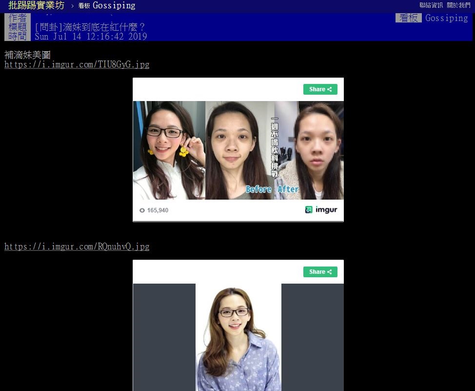 近日有網友在PTT發文《滴妹到底在紅什麼?》原PO貼上滴妹素顏及妝後的照片,打上:「滴妹學歷輔大,輔大也不是頂大啊,外表在台女網紅裡面,也只是普通,滴妹是紅到拍電視廣告的那種網紅,而且好像比她哥還紅,滴妹到底在紅什麼?」