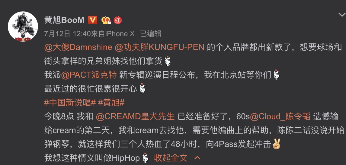 在影片的最後黃旭也留下了一句話:「今年的規則把我玩死了」,非常吊觀眾的胃口。然而黃旭在合作賽中和Cream D一起演唱《從此以後》,這首歌其實是由知名製作人「陳令韜」打造的編曲,當時Cream D在1對1PK賽中淘汰了陳令韜,而當黃旭和Cream D去找他並需要他編曲的幫助時,陳令韜二話不說就開始彈鋼琴,在48小時中不斷幫助兩人完成歌曲,許多網友也感動的直呼:「這種情義叫做Hiphop」。