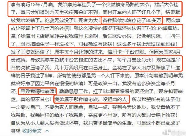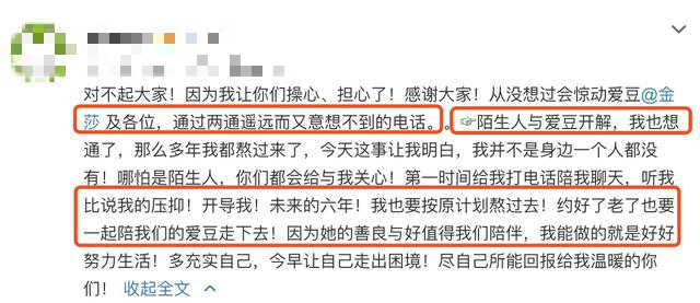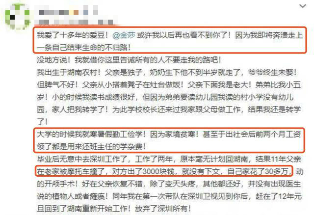 結果正當她努力還債之際,她竟然因為將信用卡借給有7、8年交情的閨蜜,結果卡債逾期被起訴到法院,而閨蜜卻分文也拿不出來。更慘的是,6年債務眼看就要還清了,卻因國家政策變化,平台欠款再次將原PO壓垮,加上其弟弟是沒擔當的啃老族,完全沒有任何親友能幫得上忙,導致她精神最後近乎崩潰,一心想撒手人間。還好金莎看到了這則貼文,並留言說道:「我希望還能像前些天見面時那樣合照,再度見到你,請盡快看我給你發的私信。」,讓該粉絲看了備感窩心,願意接受自己偶像的勸導。