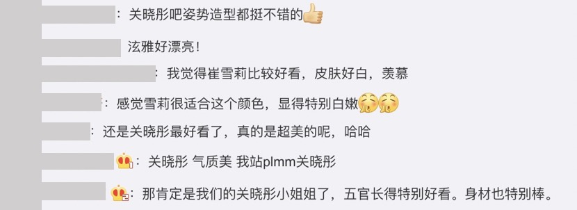 然而這一件粉紅色的紗裙也被網友發現和韓國女藝人泫雅以及雪莉撞衫,大家也紛紛將三人的顏值拿出來比較:「那肯定是我們的關曉彤小姐姐了,五官長得特別好看。身材也特別棒。」、「關曉彤吧姿勢造型都挺不錯的」、「感覺雪莉很適合這個顏色,顯的特別白嫩」、「我覺得崔雪莉比較好看,皮膚好白,羨慕」、「泫雅好漂亮!」,網友幾乎一面倒向關曉彤,然而三人呈現的風格都不盡相同,各有千秋。