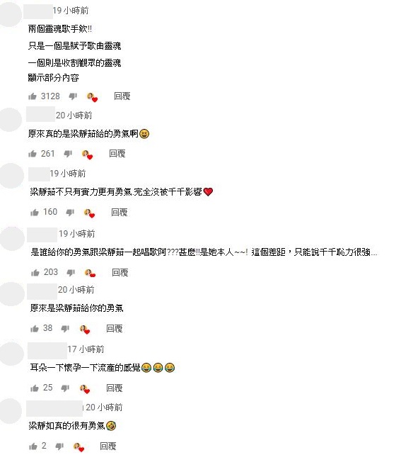 影片播出之後,網友也紛紛留言:「兩個靈魂歌手欸!! 只是一個是賦予歌曲靈魂 一個則是收割觀眾的靈魂」、「梁靜茹本人親唱,千千受到一萬點傷害」、「耳朵一下懷孕一下流產的感覺」、「是梁靜茹給我勇氣繼續看下去!」、「原來真的是梁靜茹給的勇氣啊」、「梁靜茹不只有實力更有勇氣.完全沒被千千影響」引起高度討論,而這次影片也讓粉絲看見梁靜茹親民幽默的一面。