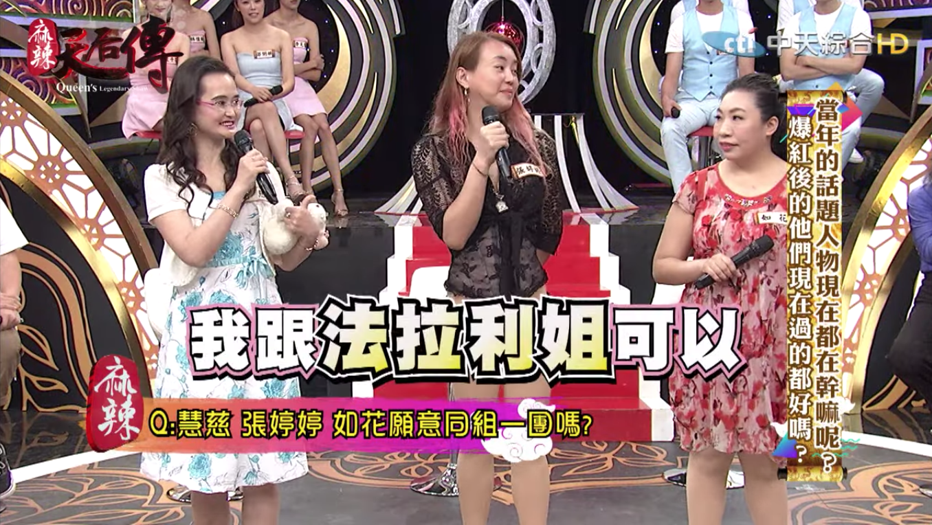 如花和慧慈屢屢傳出不合,如花也在節目中控訴,自從慧慈、Tony陳等人爆紅後,她也一直被媒體跟他們「湊咖」,但她認為自己不是靠炒作出道,不想跟他們淪為同一類人,因此拒絕被組團;慧慈也說,若要組團「我跟法拉利姐可以」,等於直接打槍如花自己也不願意跟她一起,造成場面一度尷尬。