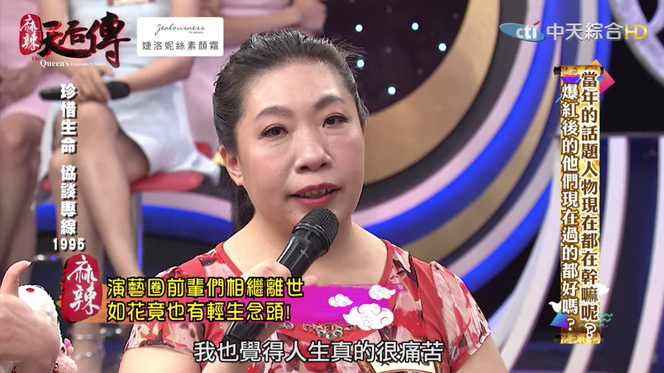 如花接著提到,最近因為演藝圈大哥一個接一個走,讓她很感慨,「我最近都想說我要不要也一起走」,此話一出驚呆現場所有人,就連利菁也急忙安慰「千萬不要,真的千萬不要!」如花表示,從她出道以來歷經許多不公平,包含當年的絲襪套頭都是犧牲自己,只為了帶給大家歡笑,