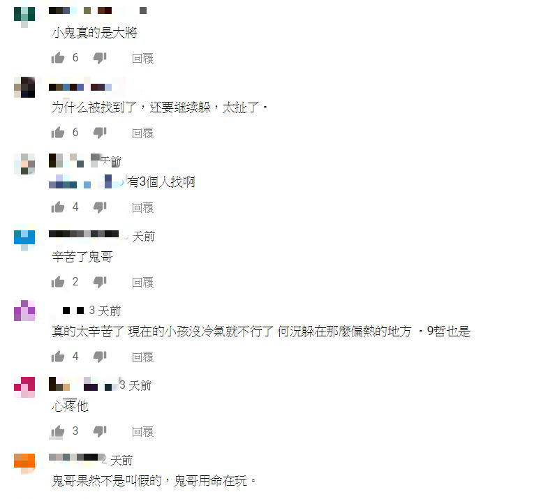 在「躲貓貓」關卡時,隊員各自尋找自己的藏匿處,小鬼發現流理台下方放置垃圾桶的櫃子很適合躲人,便直接拿起垃圾桶套在頭上,隊友忍不住表示,「玩很大的壓力是不是很大?」,但小鬼無法將自己塞進垃圾桶中,隊友建議直接用垃圾袋把自己包起來,喬裝成一包垃圾。