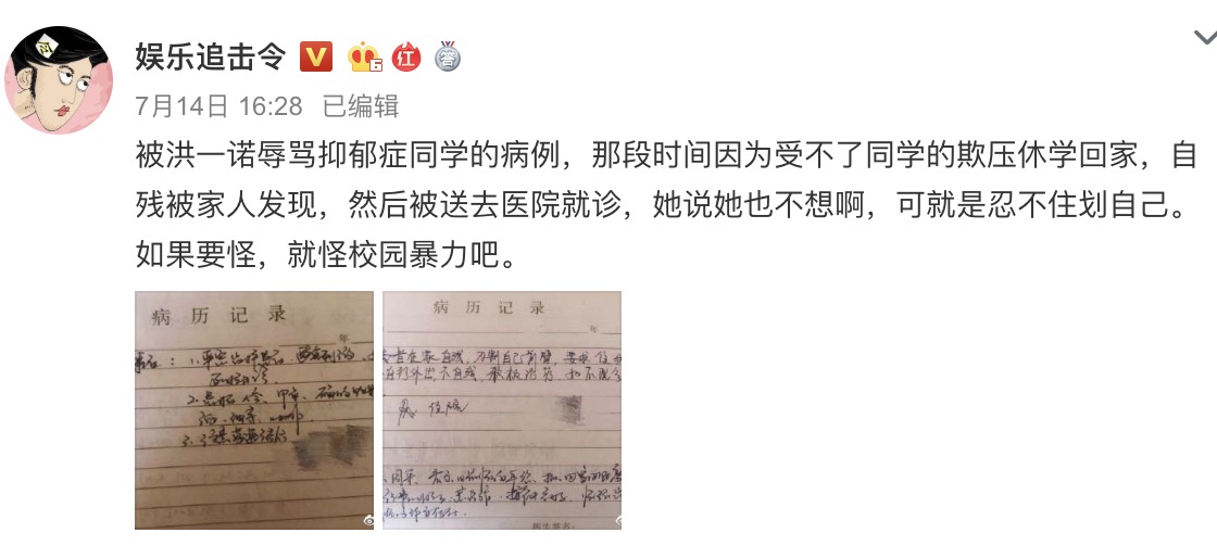 在被爆出抽菸影片後,知名娛樂博主近期又再度爆料指稱洪一諾國中時就和別人同居,甚至發出一張洪一諾和兩名朋友的合照,更稱她和這兩名朋友未成年就去夜店,根據《新浪新聞》的報導指出:「黑料中透露其實原來洪一諾在學校中是一名標準的太妹,還多次進行校園暴力甚至還辱罵其他同學,聊天記錄已經被曝光」,對話內容和她在節目中甜美的形象有些差異,其中有博主更爆出被洪一諾欺負憂鬱症同學的自述,其中提到:「再次看到她,是她參加了明日之子更加諷刺的是,路人給她標上的清純,復古,不食人間煙火的標籤」,言語之間流露出不滿與無奈。