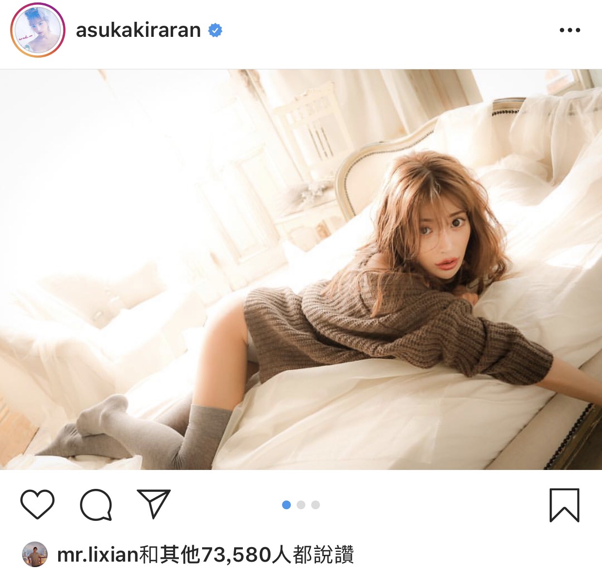 在《親愛的,熱愛的》中韓商言和佟年甜蜜的互動閃瞎觀眾的眼,不知道現實生活中李現喜歡什麼樣的女孩呢?有網友挖出李現多次在IG點讚一位女生,而這位女生就是知名人氣女優「明日花綺羅」。憑著甜美臉蛋和傲人G CUP,明日花綺羅吸引眾多男粉支持,並陪伴許多男生度過寂寞空虛的夜晚,更被稱為「D槽女神」。