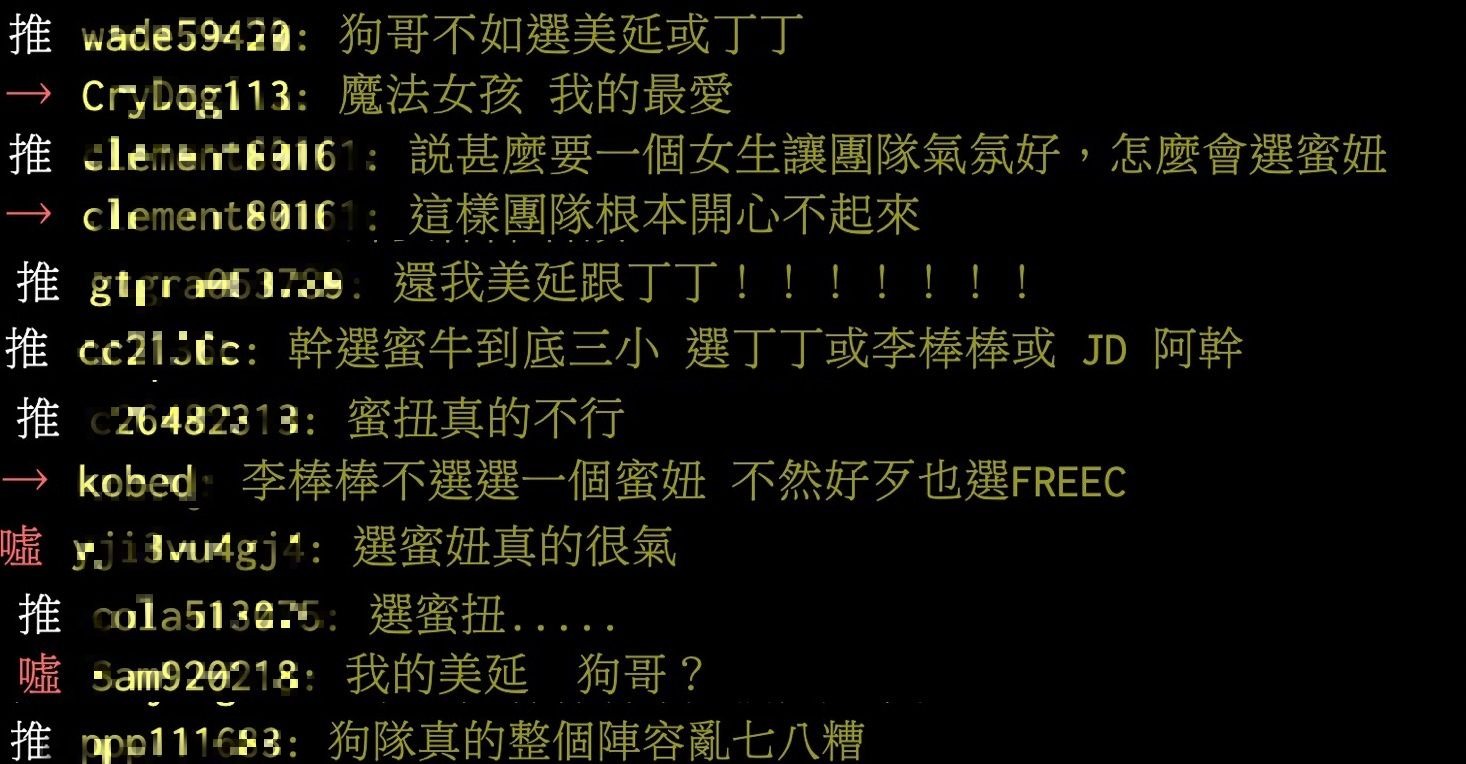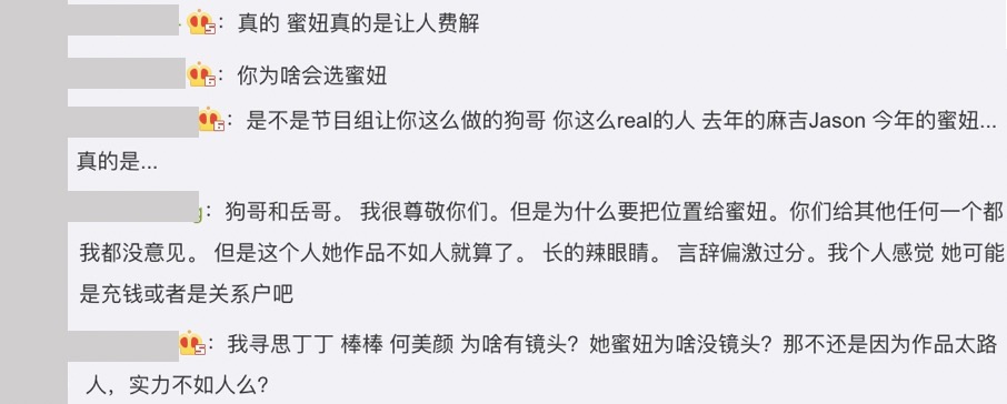 然而熱狗發文後底下還是有許多網友對於選擇蜜妞進入戰隊中還是有許多不滿,紛紛留言:「我尋思丁丁 棒棒 何美延 為啥有鏡頭?她蜜妞為啥沒鏡頭?那不還是因為作品太路人,實力不如人嗎?」、「是不是節目組讓你這麼做的狗哥 你這麼real的人 去年的麻吉Jason 今年的蜜妞...真的是…」、「真的,蜜妞真的是讓人費解」,但也有許多網友支持熱狗和張震嶽的選擇,更大讚:「狗哥Respect」。