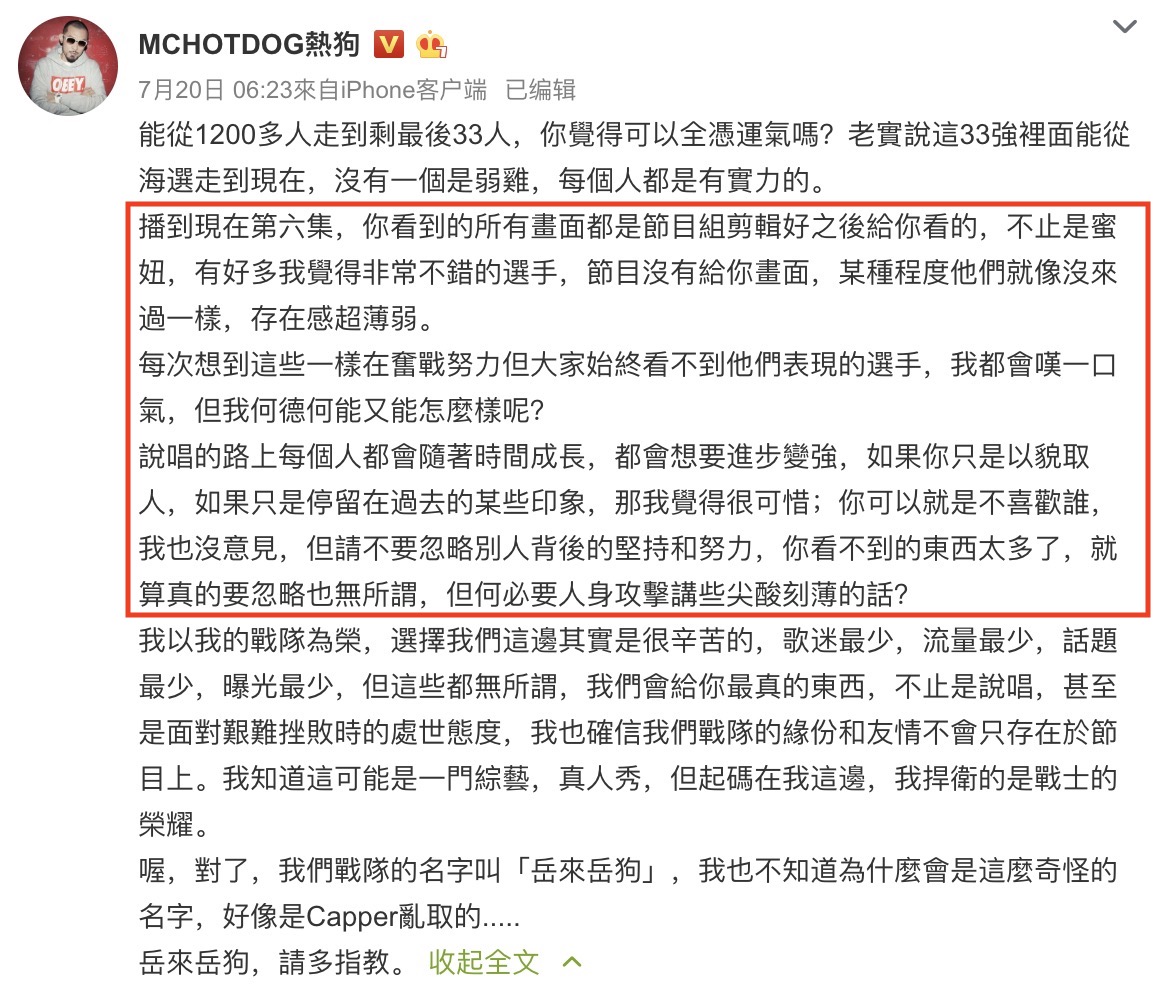 熱狗在20號早上也在社群平台中發文解釋關於他和張震嶽戰隊中選擇了蜜妞的想法,說道:「你可以就是不喜歡誰,我也沒意見,但請不要忽略別人背後的堅持和努力,你看不到的東西太多了,就算真的要忽略也無所謂,但何必要人身攻擊講些尖酸刻薄的話?」,並提到在說唱的路上大家都會想進步,如果網友們只是以貌取人或是停留在過去某些印象的話非常可惜。
