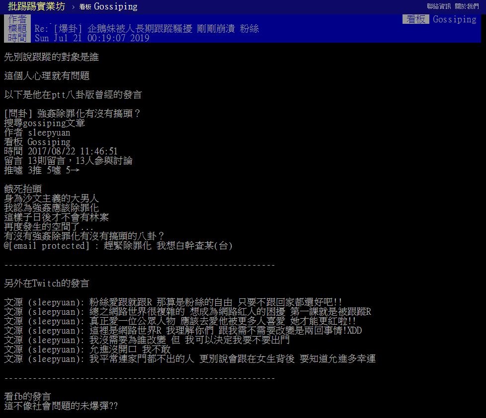 不過雖然企鵝妹叫大家別擔心,還是有網友肉搜了這位扇子男,並且發現對方的發文紀錄令人髮指!原來這位扇子男過去就曾經在PTT發文問卦「強姦除罪化有沒有搞頭?」,更被發現他在twitch的留言也毫無悔意,「粉絲愛跟就跟R 那算是粉絲的自由 只要不跟回家都還好吧!我平常連家門都不出的人 更別說會跟在女生背後 要知道允進(企鵝妹)多幸運」,令其他粉絲看見後傻眼直呼:「這不像社會問題的未爆彈??」