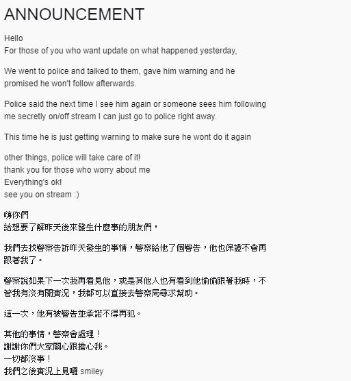 企鵝妹後來也在twitch中發表聲明:「我們去找警察告訴昨天發生的事情,警察給他了個警告,他也保證不會再跟著我了。」更強調以後如果有發現被跟蹤,也會直接去警局求助,「其他的事情,警察會處理!謝謝你們大家關心跟擔心我。一切都沒事!我們之後實況上見囉 smiley」。