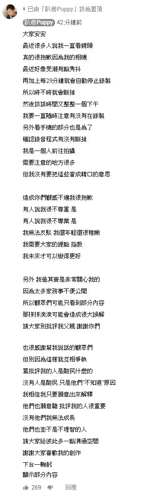 針對網友的種種質疑,趴痞表示:「另外 我爸其實是非常關心我的 因為太多家務事不便公開 所以觀眾們可能只看到部分內容 那拼拼湊湊可能會造成很大誤解 請大家別批評我父親 謝謝你們」,看得出他也相當體諒父親,希望大眾可以給他和爸爸多一點空間。