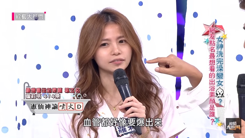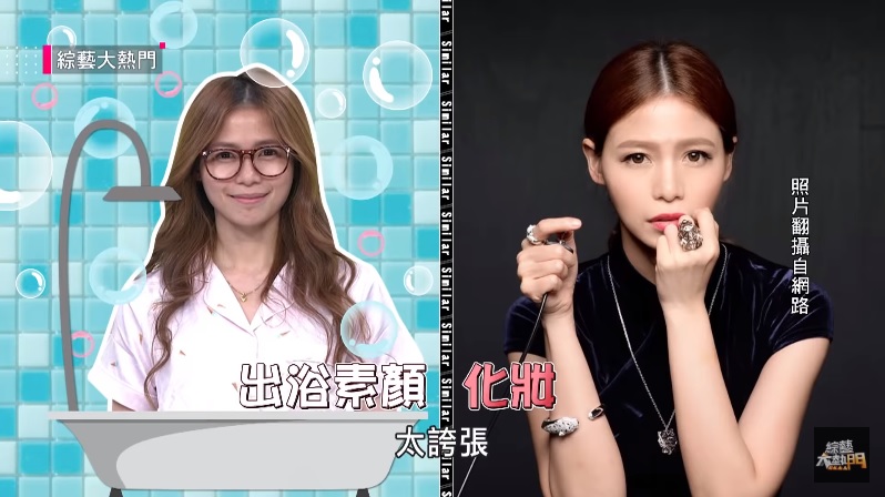 《綜藝大熱門》節目主題包羅萬象,近日以「網友點名出浴素顏!女神洗完澡變女鬼!」為題,蘿莉塔也罕見在螢光幕前公開「素顏」,大根看了先稱讚蘿莉塔素顏其實滿好看的,不過跟化妝後的照片相比之下,相差有點多;黃豪平則說她卸妝後的氣場全失,「現在卸下武裝後就覺得好像可以欺負的感覺。」」