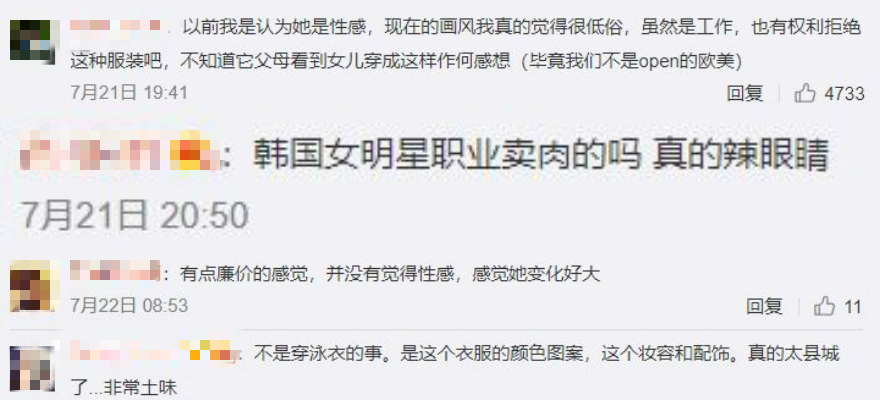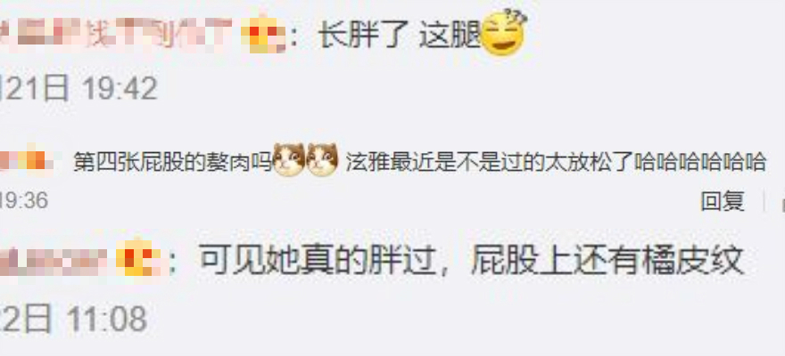 此外,還有網友認為泫雅變胖了,身上的肉變鬆弛了,不如過去看起來那樣緊實,「屁股的贅肉嗎?泫雅最近是不是過的太放松了哈哈哈哈哈哈」、「長胖了這腿」、「可見她真的胖過,屁股上還有橘皮紋」。
