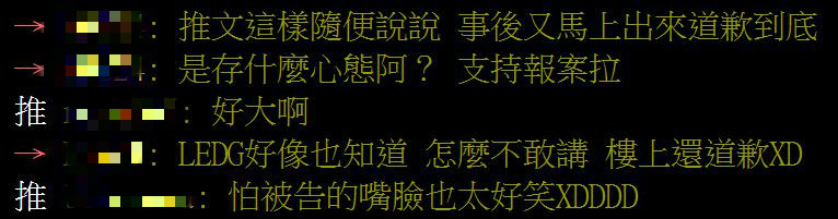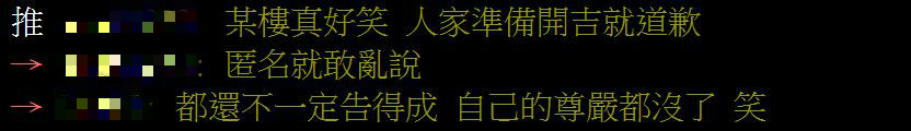 這位網友的舉動被其他鄉民酸:「推文這樣隨便說說 事後又馬上出來道歉到底」、「怕被告的嘴臉也太好笑XDDDD」、「某樓真好笑 人家準備開吉就道歉」、「都還不一定告得成 自己的尊嚴都沒了」,憑著匿名亂說話的行為引發網友撻伐。