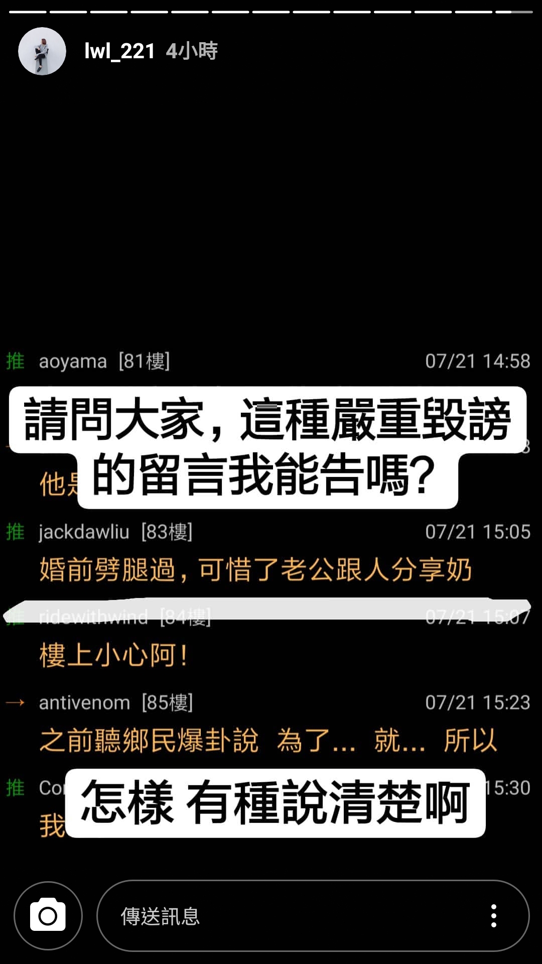 從短髮正妹的限時動態來看,可以得知其實她都有在關注留言,沒想到突然有位網友爆掛:「婚前劈腿過,可惜了老公跟人分享奶」,讓正妹看了爆氣回應:「請問大家,這種嚴重毀謗的留言我能告嗎?」其他網友也紛紛支持提告,這位爆掛者在發現事態嚴重後,才趕緊滅火道歉:「本人誤解正妹私事,特此更正澄清,願捐款慈善團體,以謝罪,跪)」。