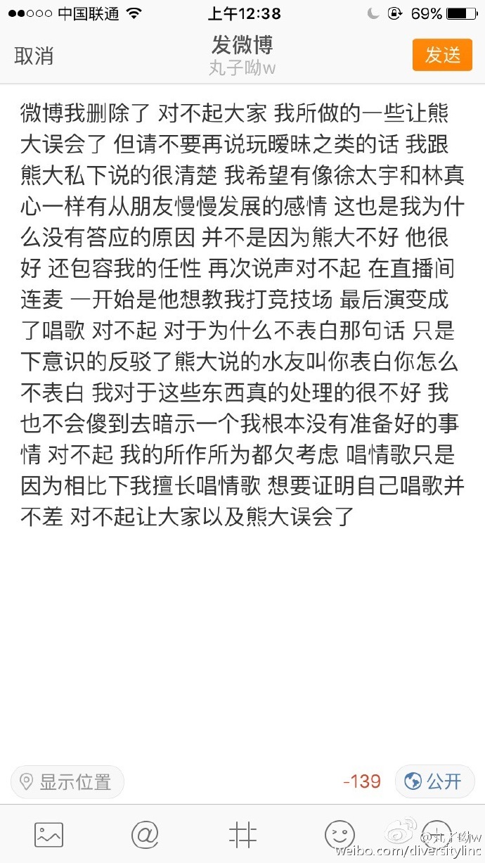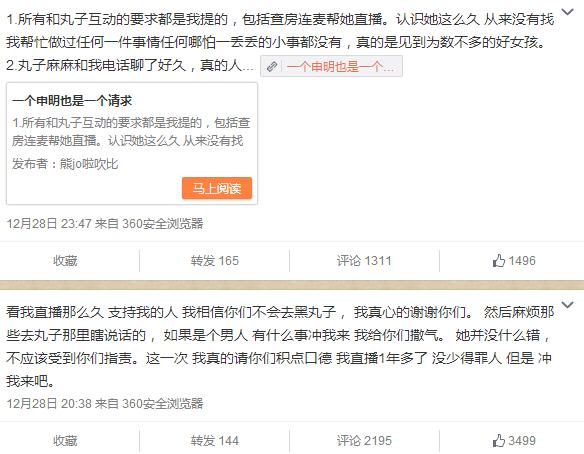 後來丸子也發了微博澄清,她表示私下有跟熊大說清楚,希望能有像徐太宇和林真心一樣從朋友慢慢發展的感情,對於反問那句「為什麼不表白」只是下意識地反駁,最後跟大家和熊大道歉,她的所作所為令人誤會。現在,熊大也重回直播平台,丸子也依舊活躍在直播圈,但是以唱歌為主。