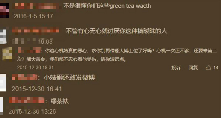許多網友都認為丸子的反問有暗示的意味,因此開始用言語攻擊丸子:「不是很懂你們這些green tea wacth」、「不管有心無心就討厭你這種搞暧昧的人」、「你這心機婊真的噁心,求你別再借熊大博上位了好嗎?」。即使被拒絕,熊大還是不忍心丸子受到這些攻擊,因此發了一篇文做聲明,希望大家不要再指責丸子,並用前程擔保丸子是個很好的女孩。