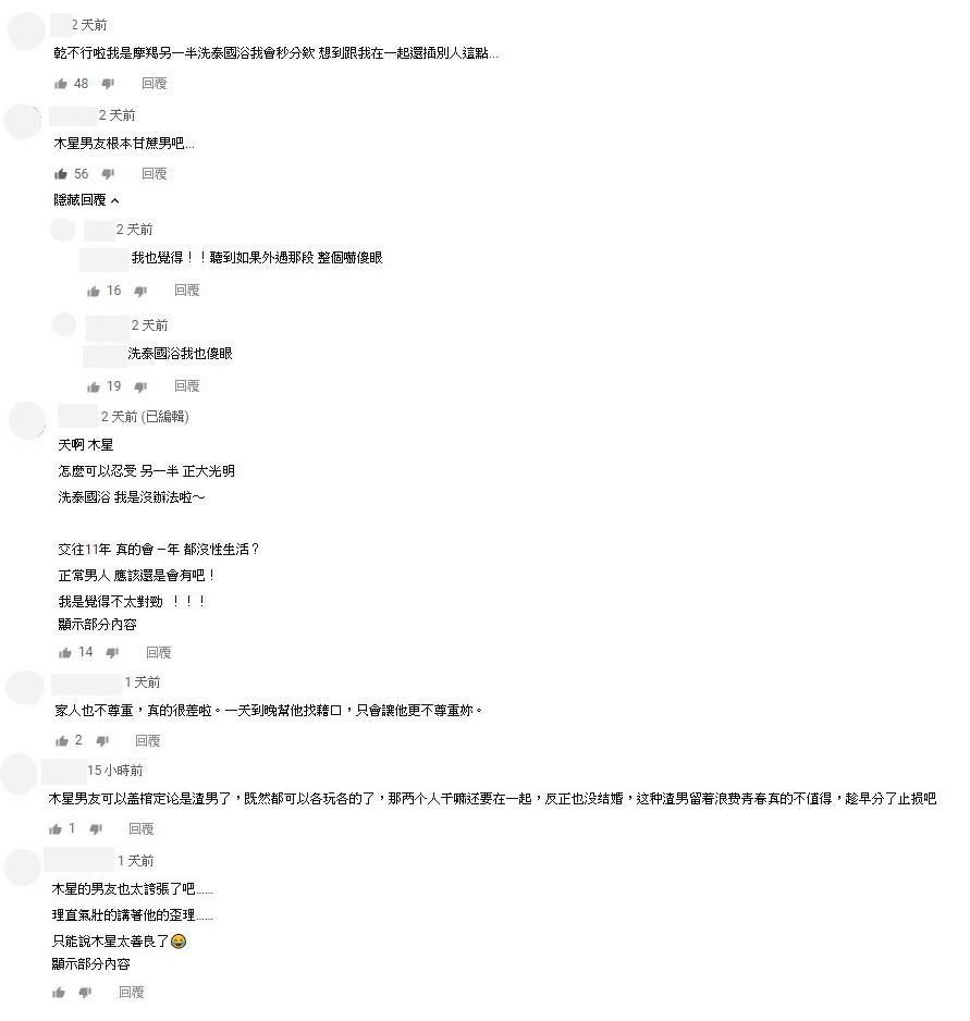 木星和男友的相處模式也讓網友大開眼界,紛紛留言討論:「不行啦我是摩羯另一半洗泰國浴我會秒分欸 想到跟我在一起還X別人這點」、「木星男友根本甘蔗男吧...」、「聽到如果外遇那段 整個嚇傻眼」、「天啊 木星 怎麼可以忍受 另一半 正大光明 洗泰國浴 我是沒辦法啦」、「家人也不尊重,真的很差啦。一天到晚幫他找藉口,只會讓他更不尊重妳。」不過雖然部分男友難以接受,不過感情還是兩個人的事,只能說每對情侶的相處方式都不一樣。