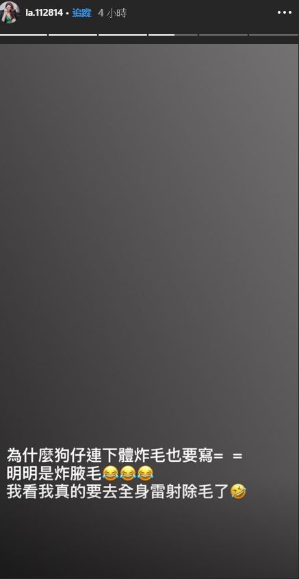 另一方面,蕾菈也在自己的限時動態中發文,不過她僅針對週刊報導她「下體炸毛」回應,笑稱:「為什麼狗仔連下體炸毛也要寫,明明是炸腋毛,我看我真的要去全身雷射除毛了」,後來也分享了她去韓國的動態,心情看似不受影響。