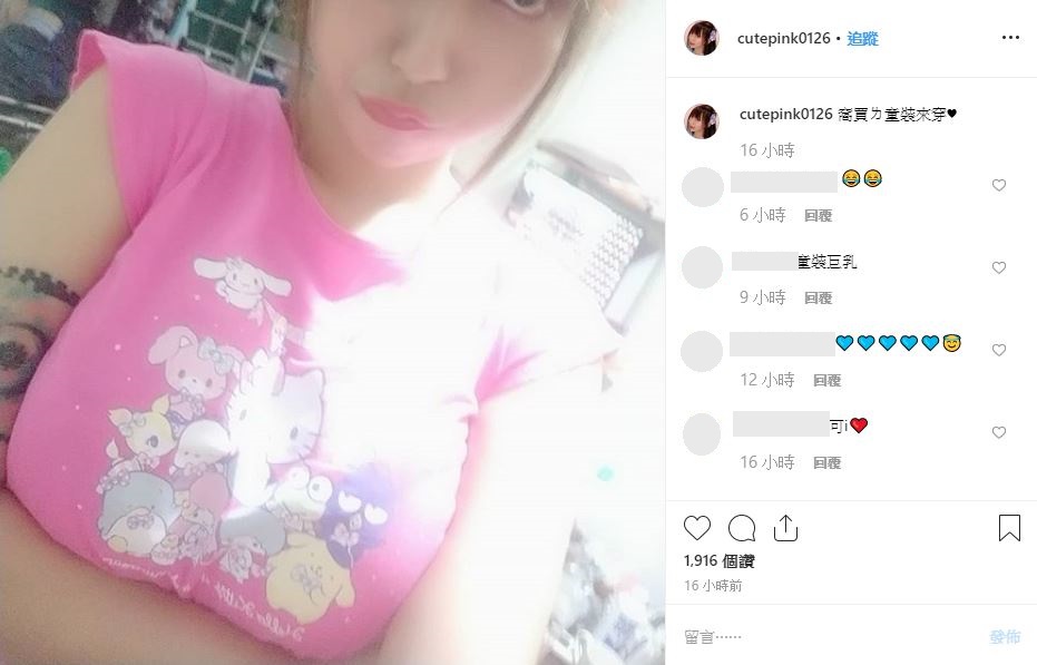 星諠昨在IG貼上近照,只見性格搞怪的她,這次竟特別買了童裝來穿,桃紅色的衣服加上夢幻的卡通圖案,讓她整個人也添了許多青春洋溢的氣息,不過值得一提的是,因為星諠有G cup的好身材,讓她穿上童裝後胸前的雙峰變得格外明顯,也引起許多粉絲討論。