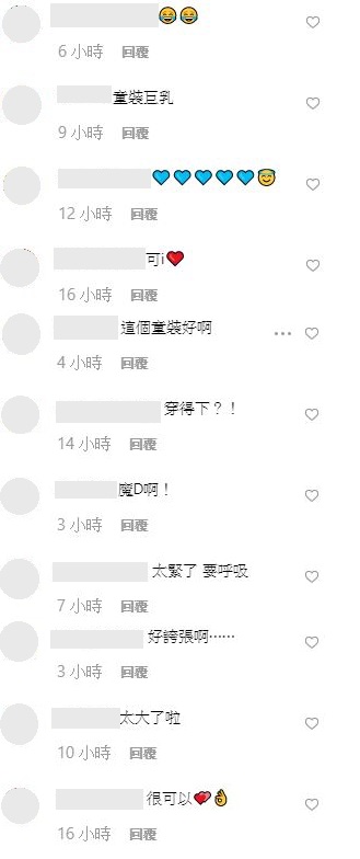 粉絲見狀後紛紛留言:「太大了啦」、「童裝巨乳」、「這個童裝好啊」、「穿得下?!」、「好誇張啊⋯⋯」、「很可以?」、「可愛??」、「太緊了 要呼吸」、「好看?」,只能說星諠的好身材真的十分令人稱羨。