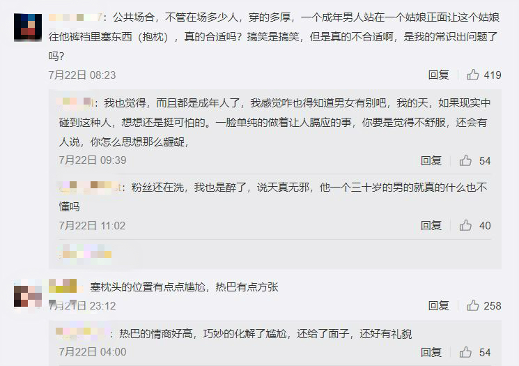 接著當Henry穿好玩偶裝時,熱巴提議將剩下的抱枕藏進玩偶肚子,正當熱巴努力的藏抱枕時,Henry朝著她狂喊:「塞啊!用力塞!」,甚至用屁股對著熱巴,示意她以這種方式塞,只見熱巴露出了極為無奈的表情。此片段引起網友熱議,網友認為Henry行為言語不尊重女性,「塞枕頭的位置有點點尷尬,熱巴有點慌張」、「做為女生真的很反感劉憲華這種行為」、「在我看來這就是耍流氓,裝瘋賣傻人設呵呵了」,也紛紛稱讚熱巴情商高,處理的很恰當。
