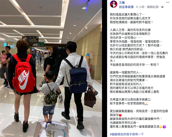 於是文章尾聲,王瞳開始致歉,說道「淚水因著陽光折射而閃耀著⋯對不起被風波波及到的人⋯我的確有許多可以修正改進的地方,我也會藉此將其化為動力在事業上衝刺,也希望大家可以高抬貴手與貴,給予當事者一些空間跟餘地。」