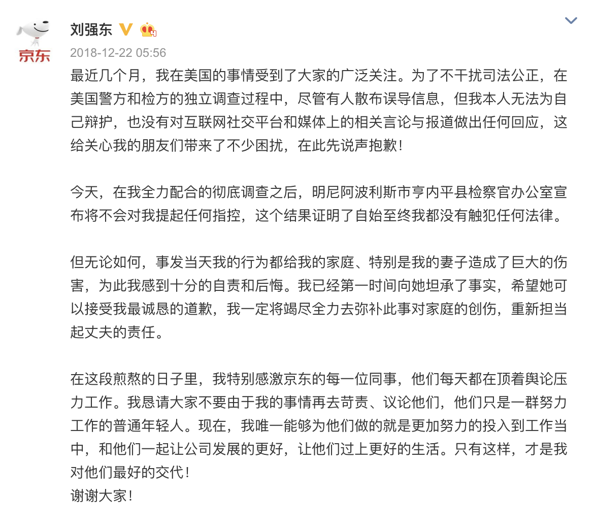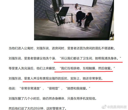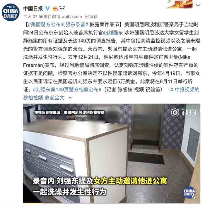 2018年時劉強東被爆出在美國時涉嫌性侵女大生,而根據路透社的報導指出,該名女學生稱自己被灌酒,稱飯局為「陷阱」,而用餐完畢後她被劉強東拉入車內「動手動腳」,違背其意願,而12月時調查結果指出是雙方自願,被判免起訴。在近日美國警方公開了最終149頁的調查報告,記錄顯示是女大生主動邀請劉強東去她的公寓,並且兩人曾在車內激吻,兩人一起回到公寓後還一起洗鴛鴦浴,接著發生了性行為。