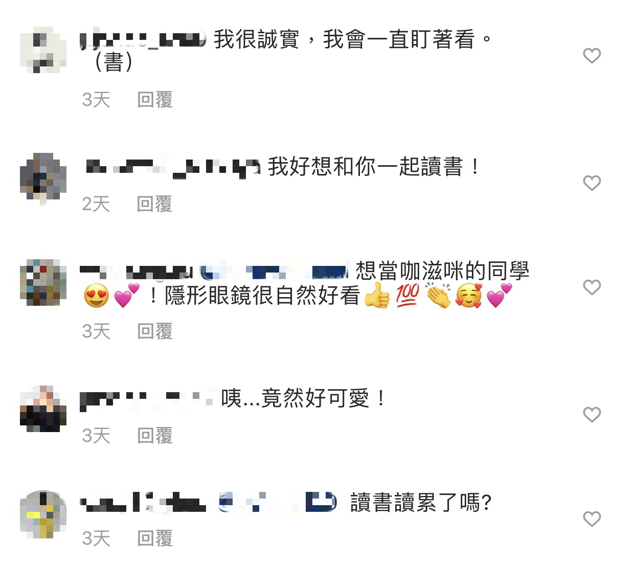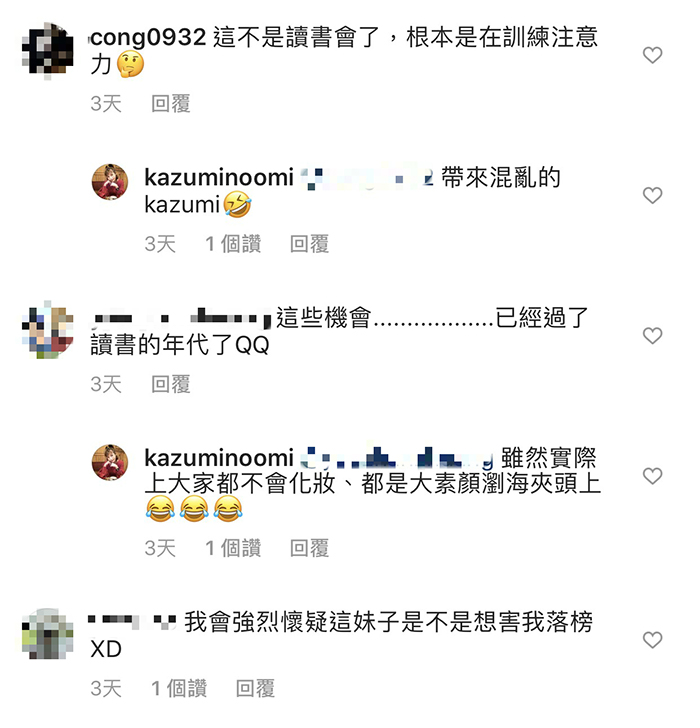 此系列照片影片咖滋咪附文表示,「當讀書會,而你同學是爆乳的時候」。雪乳瞬間的晃動讓粉絲紛紛表示已被震暈,「那個震動……我服」、「這不是讀書會了,根本是在訓練注意力」、「這些機會……已經過了讀書的年代了QQ」、「我會強烈懷疑這妹子是不是想害我落榜」、「我好想和你一起讀書」。
