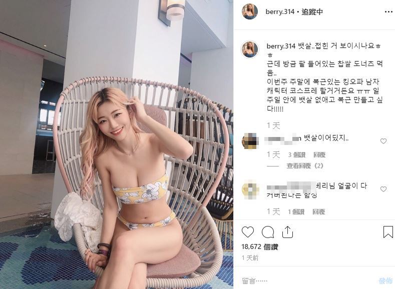 韓國實況主Berry最初在遊戲平台Twitch為人所知,不過他利用個人身材優勢時常在IG和YouTube挑戰韓國舞曲,而喜歡Cosplay的他更總是挑戰漫畫中的性感女角像是娜美、不知火舞等成功爆紅,目前IG追蹤人數已經突破25萬。然而Berry似乎仍不滿意自己的身材,甚至放話要練出腹肌,16日公開的照片中,Berry穿著比基尼坐在竹椅上,稍微彎腰時意外曝光肚子上的脂肪,雖然當時不少網友除了激勵Berry說到「你看起來還是很美啊」、「只要花多一點的時間跟耐心就會有腹肌的」、「我們一起來減脂肪」,卻有大批粉絲認為Berry的身材已經很完美。