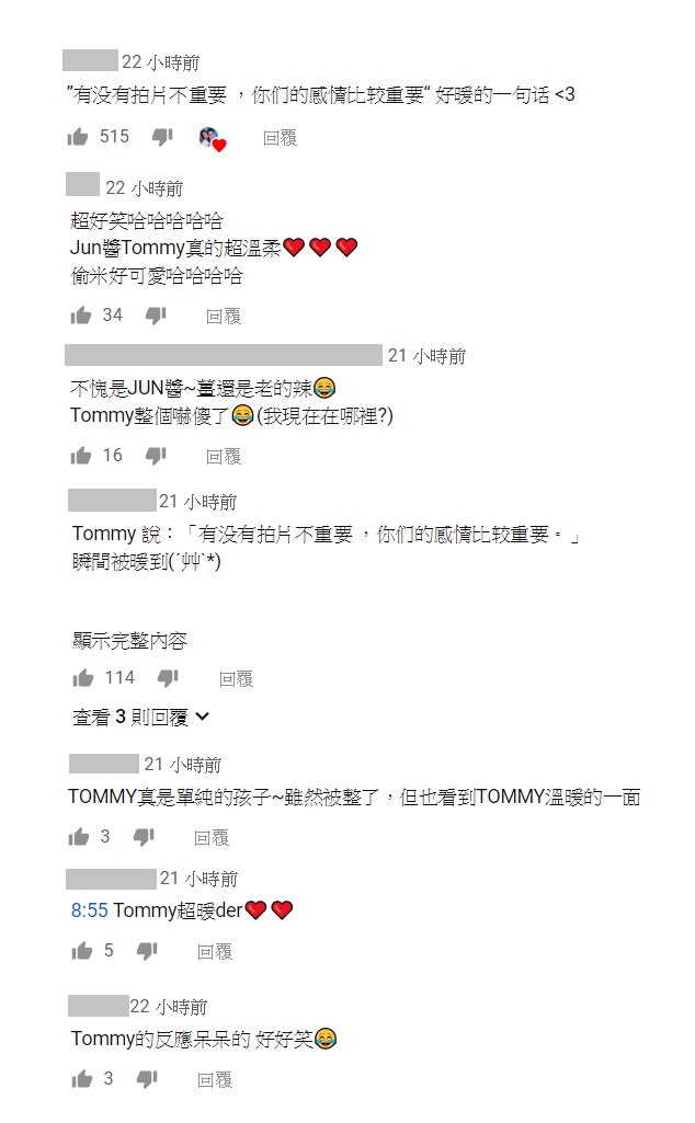 Inthira的離開更讓「Jun醬」和「Tommy」感到慌張,「Tommy」連忙勸說Jeff,甚至起身要將攝影機關掉,中斷拍攝,更直言「有没有拍片不重要 ,你們的感情比較重要」,親切地關心著Jeff,而「Tommy」暖心之舉更獲得許多網友的讚賞,紛紛表示「好暖的一句話」「Jun醬Tommy真的超溫柔」「看到TOMMY溫暖的一面」,為這場PRANK畫下一個暖心的結局。