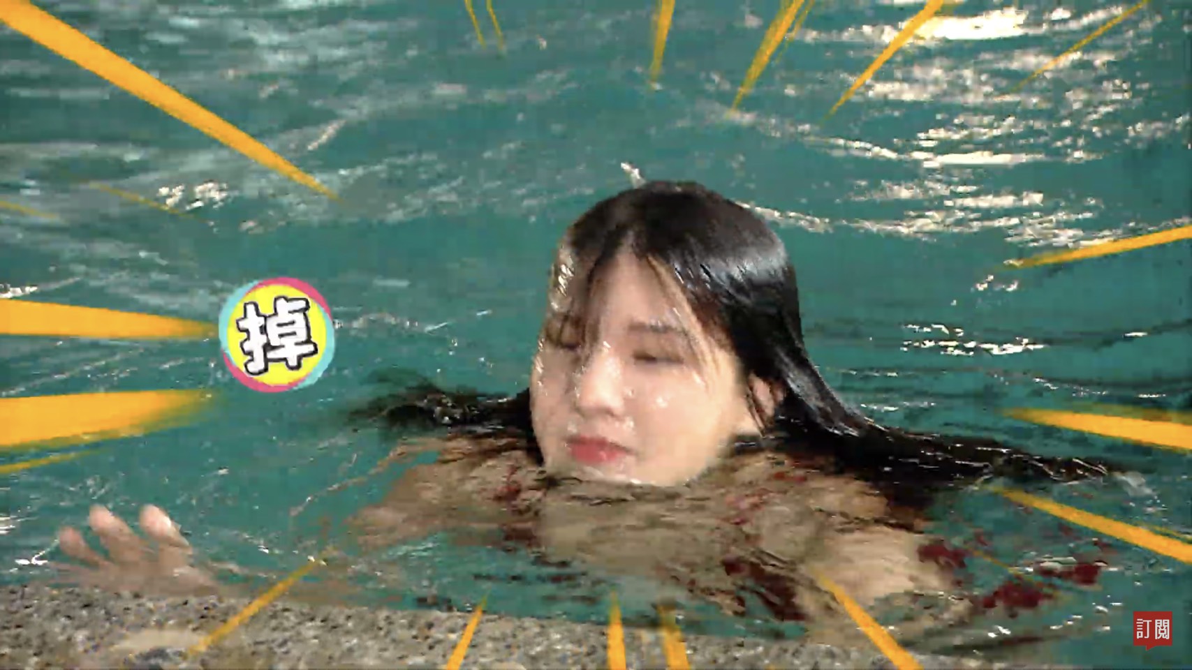 接著上場的是元元,只見她展現曼妙的泳姿,在浮出水面前先潛入水底,一出水面驚艷眾人,上岸後更直接脫下短褲露出性感的泳褲,火辣的畫面讓現場男生歡聲雷動,最後元元在泳姿美儀比賽以4:3獲勝。