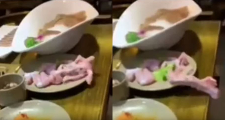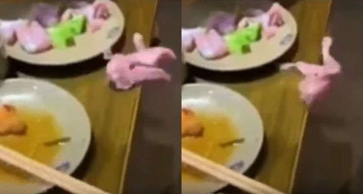 影片中,該名網友在外用餐,桌上擺滿了不少生鮮肉品,不過吃到一半,手邊盤子上被大切八塊的雞肉,其中一個生肉竟從尾端處伸出像手一般的肉塊突然開始試圖蠕動,接著還一路抽搐跳到盤子外,沒想到生命力極強的雞肉塊,又直接彈到地上,嚇到一旁用餐的人當場連聲尖叫急忙離開座位,幾乎都快哭出來了。