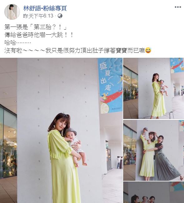 原來這張照片只是林舒語為了撐起圈圈,才會用力將肚子頂出,讓人誤以為她又懷孕了,而她也和粉絲分享和老公間發生的趣事:「第三胎?!傳給爸爸時他嚇一大跳!!哈哈」對此有網友表示應該衣服的緣故,其實仔細看林舒語的肚子並不大,也有網友乾脆順著這波誤會,幽默的祝賀:「恭喜恭喜啊」,相當搞笑。