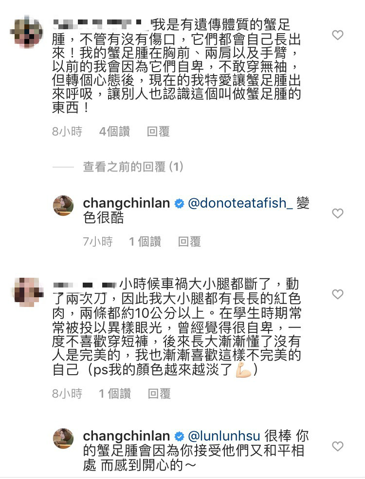 張景嵐的一番話讓同樣擁有蟹足腫的網友感到贊同,並紛紛交流自身經驗:「我的蟹足腫在胸前、兩肩以及手臂,以前的我會因為它們自卑,不敢穿無袖,但轉個心態後,現在的我特愛讓蟹足腫出來呼吸」、「曾經覺得很自卑,一度不喜歡穿短褲,後來長大漸漸懂了沒有人是完美的,我也漸漸喜歡這樣不完美的自己」,溫暖的話語深深感染網友,讓他們擁有強大力量去對抗異樣眼光。