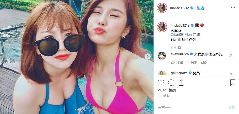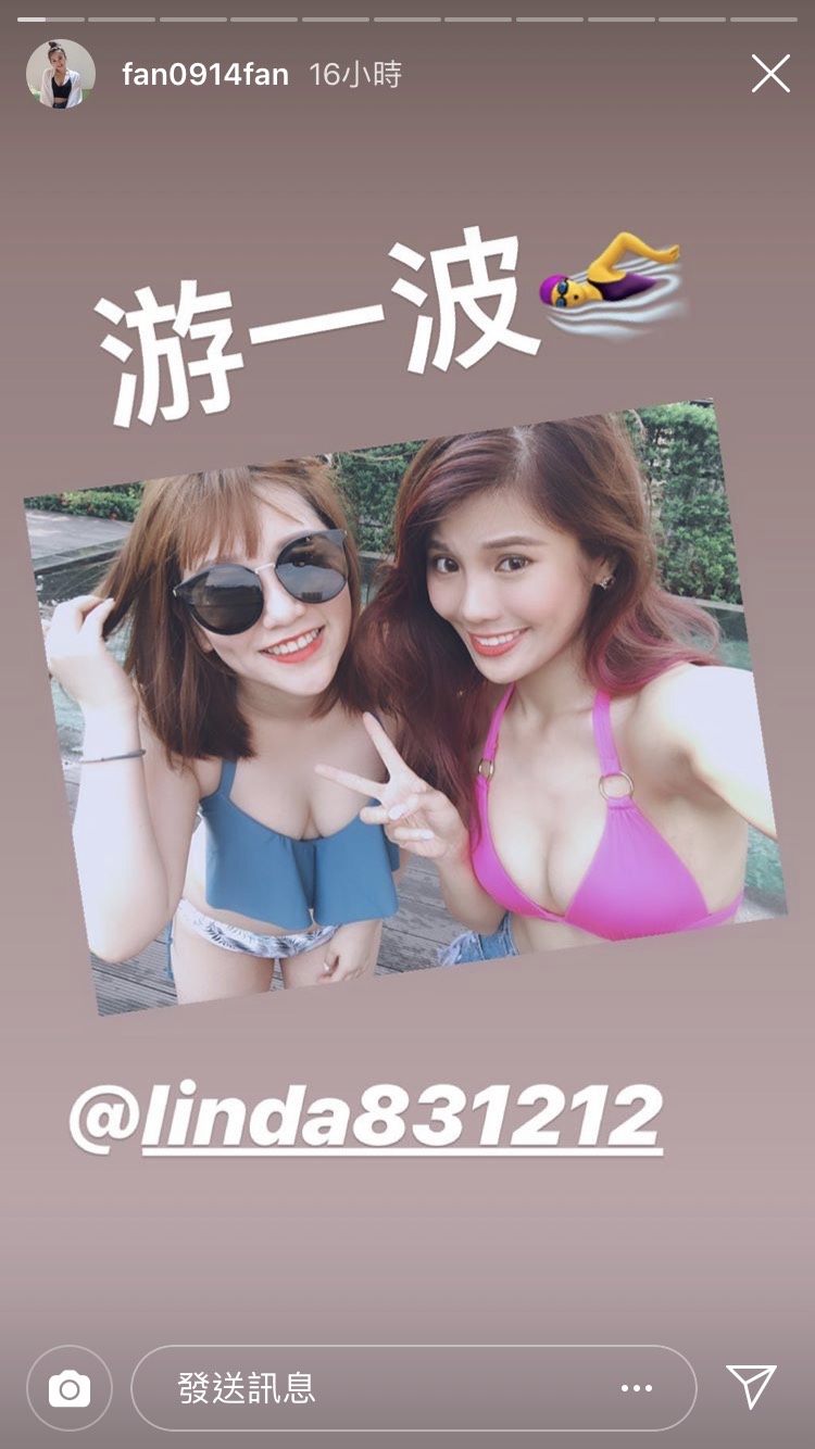 近日凡凡和琳妲一起去泳池游泳,凡凡也在自己IG限時動態中分享泳裝照,只見凡凡身穿水藍色綁帶比基尼,大露豐滿的北半球,琳妲的桃紅色比基尼也毫不遜色,呈現出青春活力的夏日風情。此外凡凡也分享了另外一張三人戴上蛙鏡、泳帽的照片,笑稱:「這張才對嘛!」