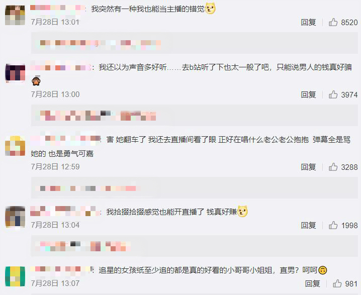 這段影片掀起網友熱議,「這些直男粉到底多蠢,平時擋臉的肯定是不好看的阿」、「我突然有一種我也能當主播的錯覺」、「只能說男人的錢真好騙」,許多粉絲直呼受騙。據了解,曾為她花10萬元(約台幣30萬)的土豪一氣之下將帳號直接刪除,雖然之後她不斷發視頻證明自己不醜,但粉絲已經不買帳了。