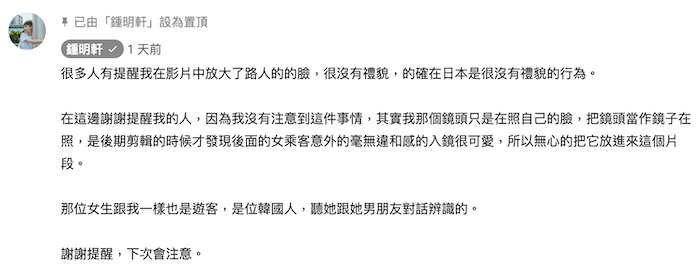 對此,鍾明軒在28日於影片下方回應坦承,「在影片中放大了路人的臉,很沒有禮貌,的確在日本是很沒有禮貌的行為」,同時他也謝謝大家的提醒並解釋,「當時鏡頭只是在照自己的臉,後期剪輯的時候才發現女乘客意外的毫無違和感入鏡很可愛,所以無心的把她放進來這個片段,對方也是一位遊客,從她和男友對話中可以聽出她是韓國人,下次會注意。」
