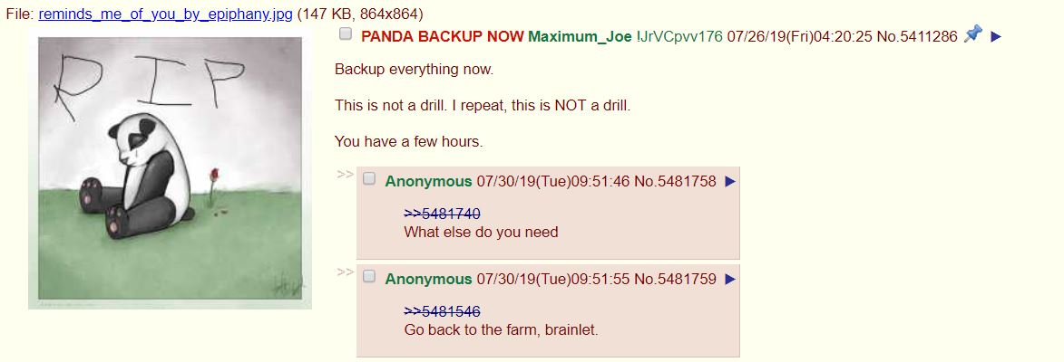 熊貓網的管理員「Maximum_Joe」26日在4chan討論區發公告:「現在備份一切,這不是演習,你有幾個小時。」預告站長Tenboro決定將於幾個小時後關閉熊貓網,引發老司機們恐慌,在各大論壇互相通知緊急備分,而熊貓網現在確實已經無法存取資料,對此不少動漫迷發文哀悼,甚至形容如果京阿尼是動畫界的911事件,那麼E站關閉就是紳士界的亞歷山大圖書館大火。
