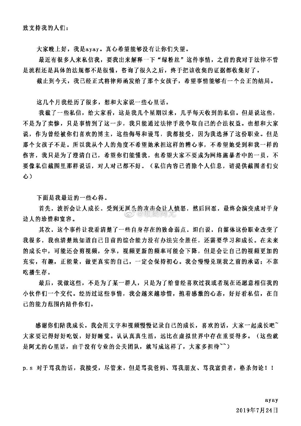 阿尤24日在微博發文表示,許多人希望她能解釋「綠粉絲」這件事情,在她諮詢過法律流程後,她將證據收集好,並發了律師函給爆料的那名女子,希望事情能有一個公正的結局。似乎是澄清自己並沒有搶粉絲男朋友,但又沒有明確的說明,讓網友無法相信。在網上關於阿尤的黑歷史並不少,除了直播吃腐爛龍蝦,還曾經餵狗吃蛋糕,視頻標題也常帶有性暗示,引發許多爭議。