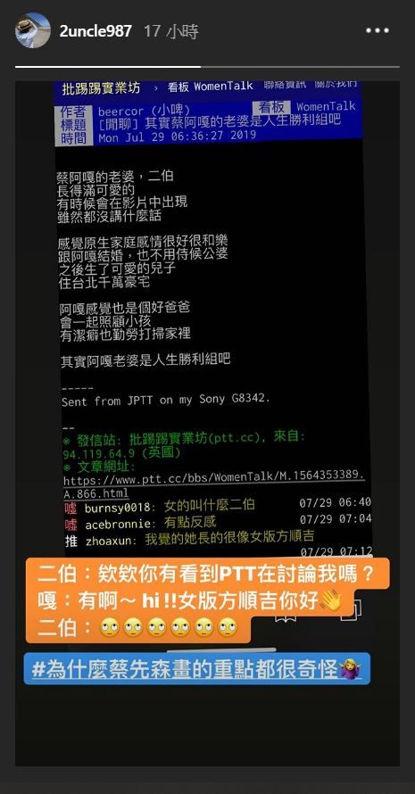 PTT鄉民嘲弄「二伯」女版方順吉 引本尊神回:比較讓我吐血的是枕邊人