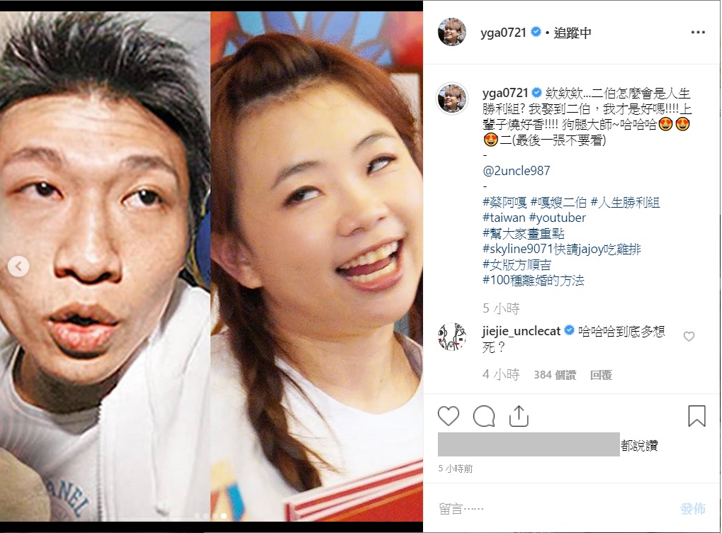 除此之外,身為老公的「蔡阿嘎」也在其IG上PO文表示「二伯怎麼會是人生勝利組?我娶到二伯,我才是好嗎!!!!」,更逗趣地在照片裡放入了「二伯」和方順吉的對比圖,大開老婆玩笑,以幽默化解所有紛擾,十分可愛!
