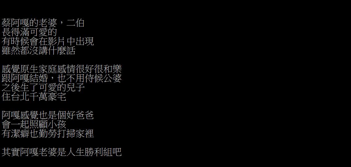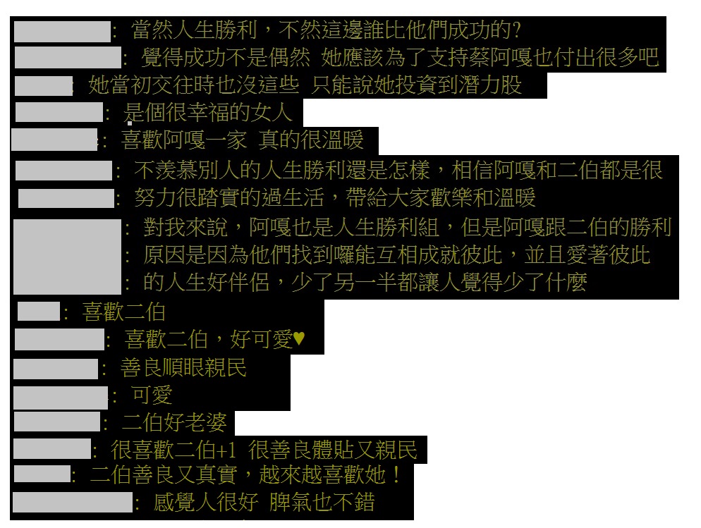 「蔡阿嘎」與「二伯」一路從學生時期的戀愛,走到了今日幸福美滿的家庭生活,兩人更於「蔡桃貴」出生後,搬進了台北的百萬豪宅中,而在他們各自的社群平台上,也時常分享出他們一家和樂的模樣,羨煞旁人。近日便有人PTT上分享了自己對「二伯」的看法,網友表示「(二伯)感覺原生家庭感情很好很和樂,跟阿嘎結婚,也不用侍候公婆,之後生了可愛的兒子,住台北千萬豪宅」,更直言「其實蔡阿嘎的老婆是人生勝利組吧」。