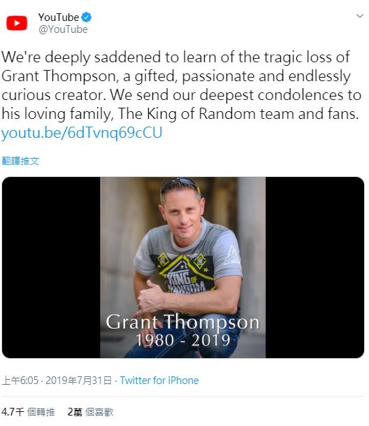 格蘭特的死訊一出不僅外界相當心痛,就連YouTube也在官方推特致意,文中說到「接獲格蘭特湯普森的噩耗我們非常難過,他是一位有天賦,充滿熱情和無窮無盡的好奇創作者。我們向他的家庭以及頻道『The King of Random』的粉絲,致上最深的哀悼」。